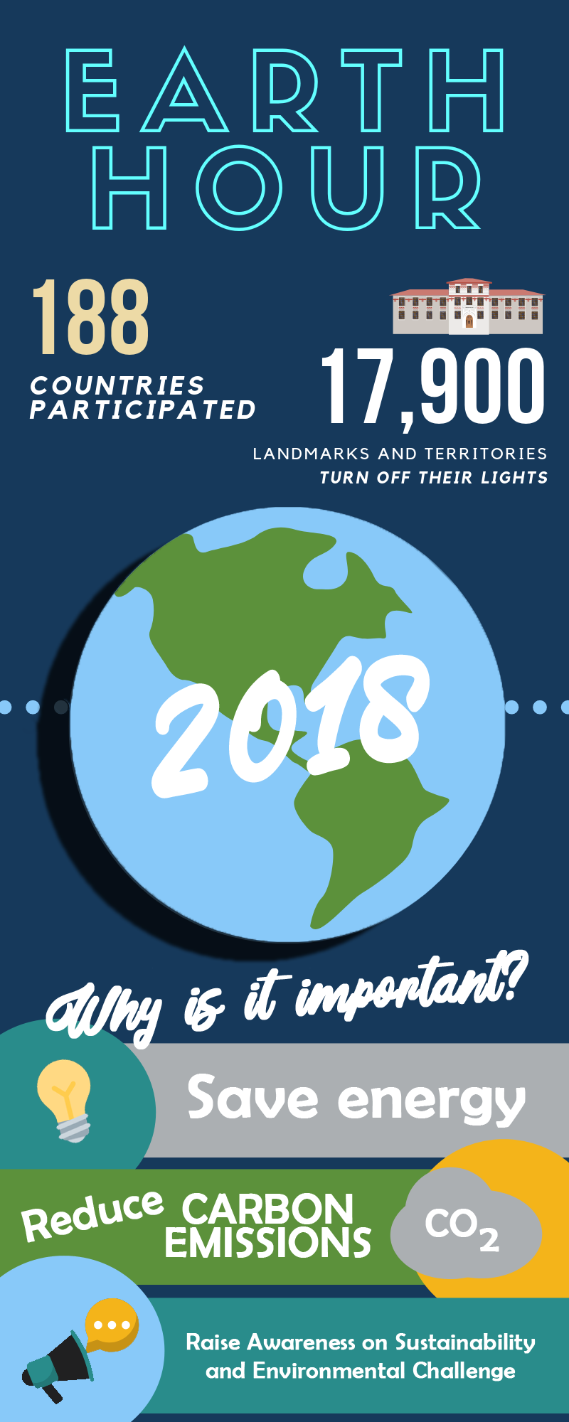 Every year, nations, communities, industries, and individuals participate in the Earth Hour, switching off non-essential lights for an hour. Last year (2018), 188 countries and territories participated and more than 17,900 landmarks and monuments around the world switched off their lights during Earth Hour.